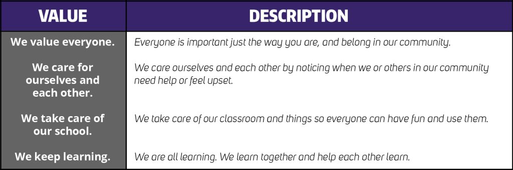 In 2024, our staff gathered to discuss the values that make our school work. Rather than rules or expectations that only applied to the children, we know that to create a truly inclusive community, we must all be accountable to each other. By having school-wide values, we can work together, model, practice, and learn as a group.