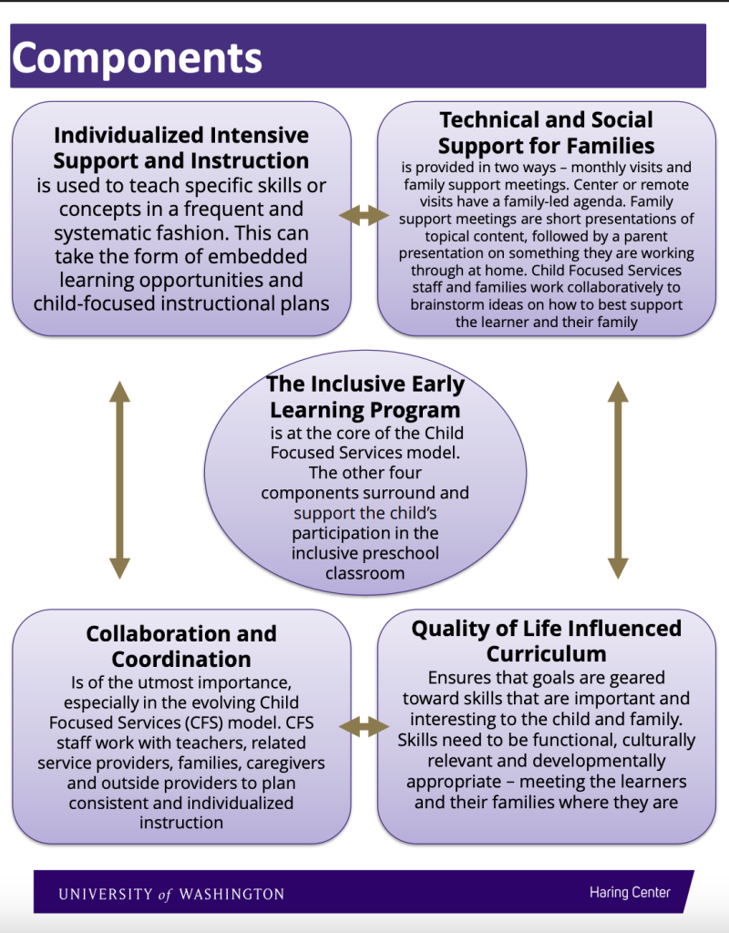 This creates many opportunities for thoughtful, individualized services for all students who participate. Instruction from CFS staff occurs primarily in the inclusive preschool classroom, embedded throughout the daily routines and activities. Some learners receive pull-out services in the Rainbow Room, which provides more opportunities for individualized explicit instruction in a quieter space. The amount of time students receive CFS in the Rainbow Room is a collaborative decision between the classroom team, family and CFS staff.